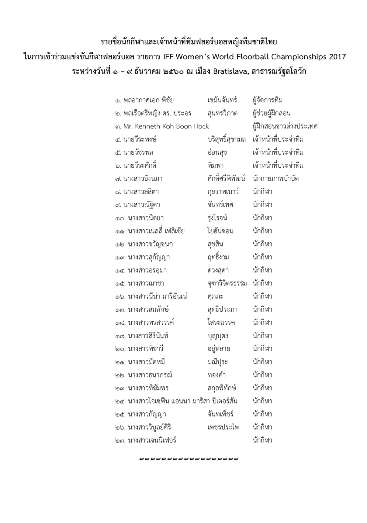 รายชื่อนักกีฬาฟลอร์บอลหญิงทีมชาติไทย รายการ IFF Women’s World Floorball Championships 2017