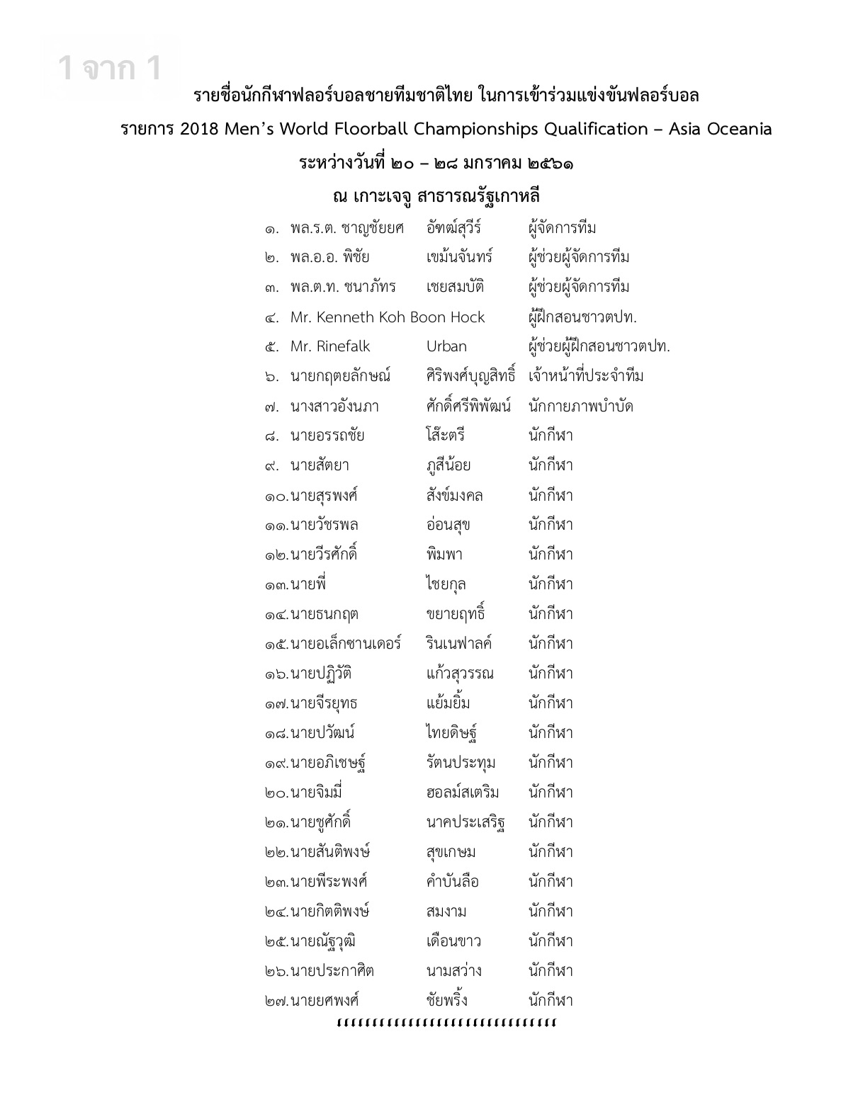 รายชื่อนักกีฬาฟลอร์บอลชายทีมชาติไทย รายการ Men’s World Floorball Championships Qualification – Asia Oceania 2018