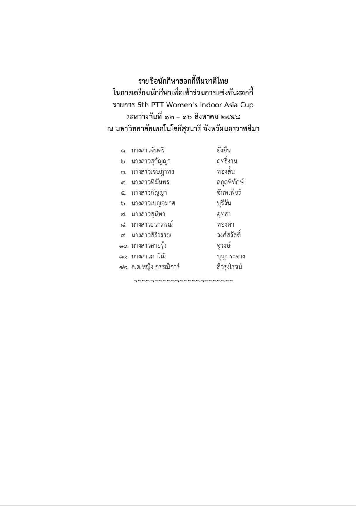 รายชื่อนักกีฬาฮอกกี้หญิงทีมชาติไทย รายการ 5th PTT Women’s Indoor Asia Cup 2015