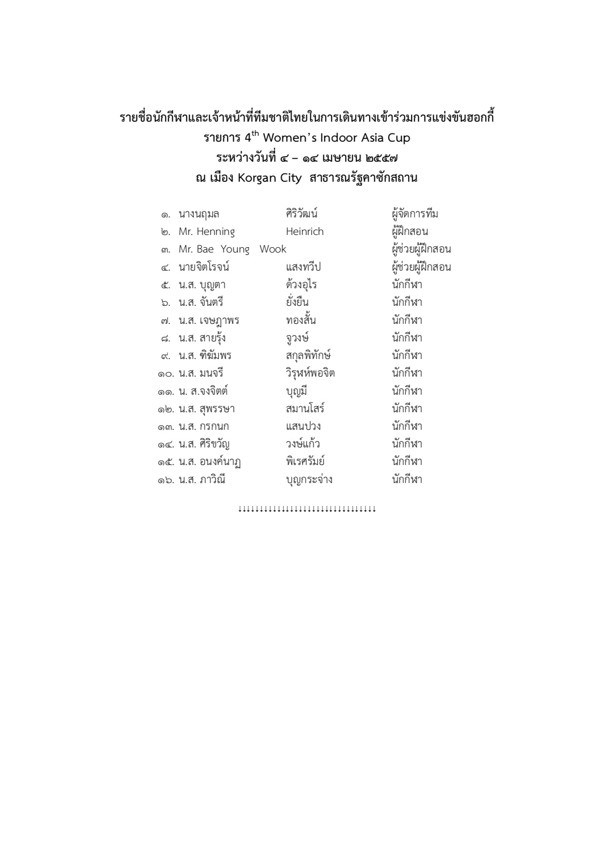 รายชื่อนักกีฬาฮอกกี้หญิงทีมชาติไทย รายการ 4th Women’s indoor Asia Cup 2014