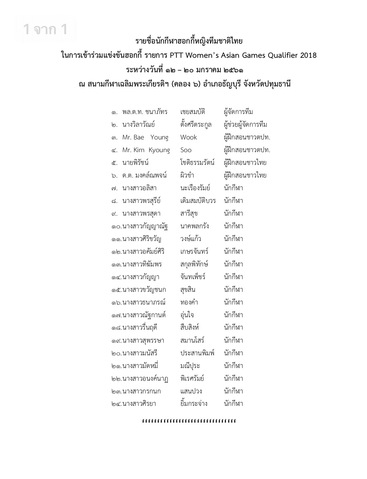 รายชื่อนักกีฬาฮอกกี้หญิงทีมชาติไทย รายการ PTT Women’s Asian Games Qualifier 2018