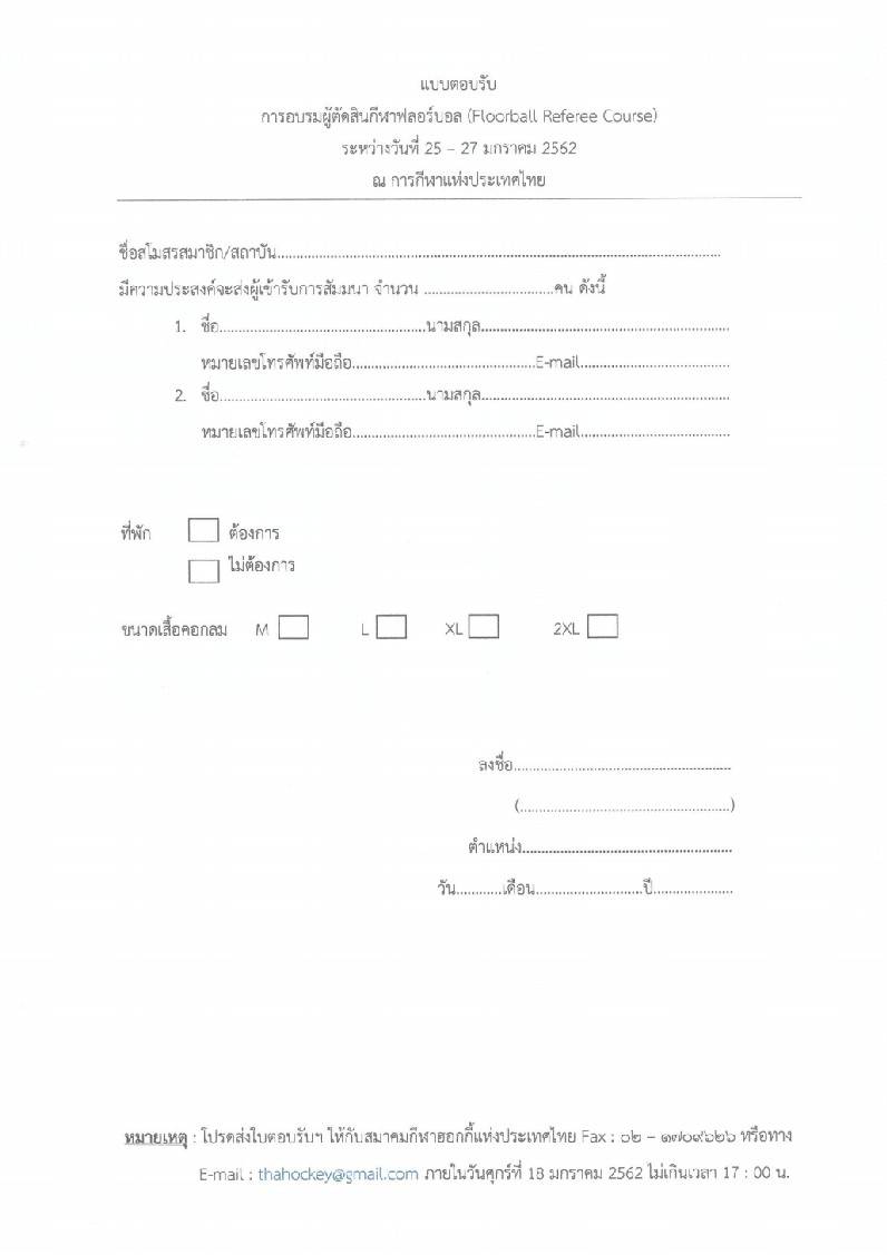 *** กรุณาส่งใบตอบรับกลับมายังสมาคมกีฬาฮอกกี้แห่งประเทศไทย ภายในวันศุกร์ที่ ๑๘ มกราคม ๒๕๖๒ ไม่เกินเวลา ๑๗.๐๐ น. ทาง Fax : ๐๒ – ๑๗๐๙๖๒๖ หรือทาง E-mail : thahockey@gmail.com