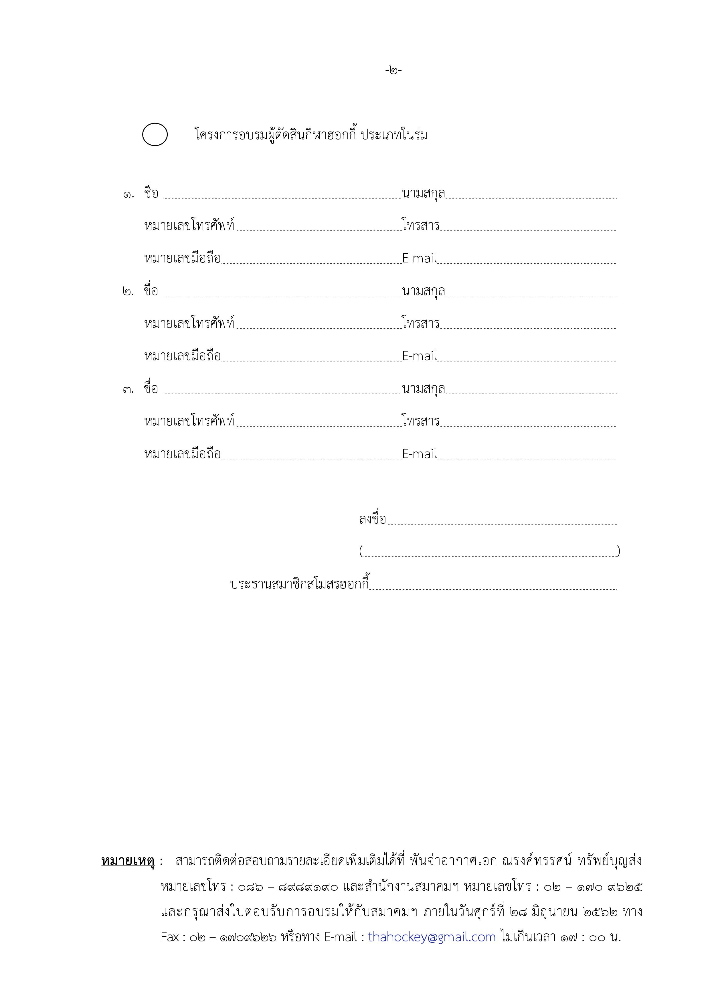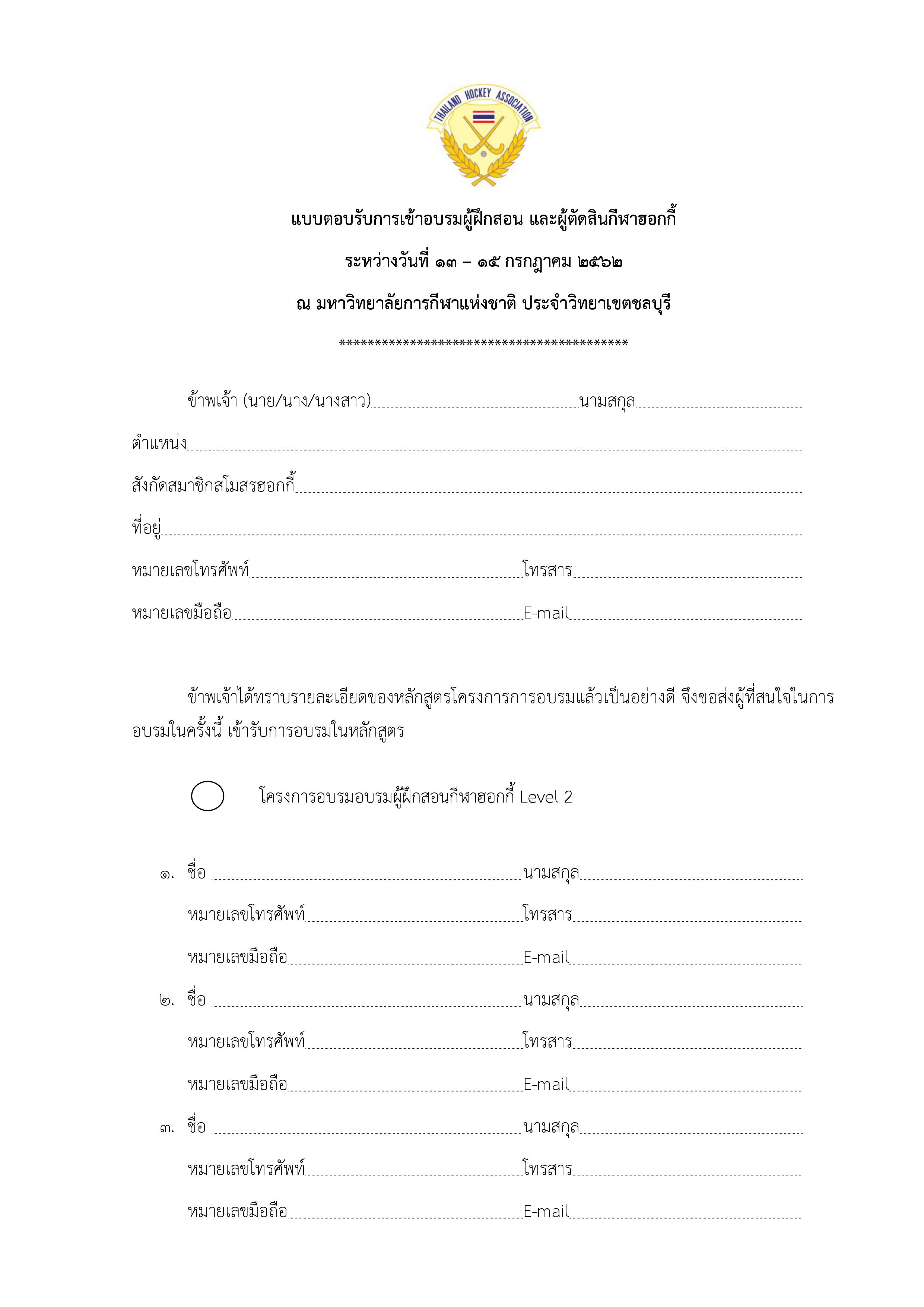 แบบตอบรับการเข้าอบรมผู้ฝึกสอน และผู้ตัดสินกีฬาฮอกกี้