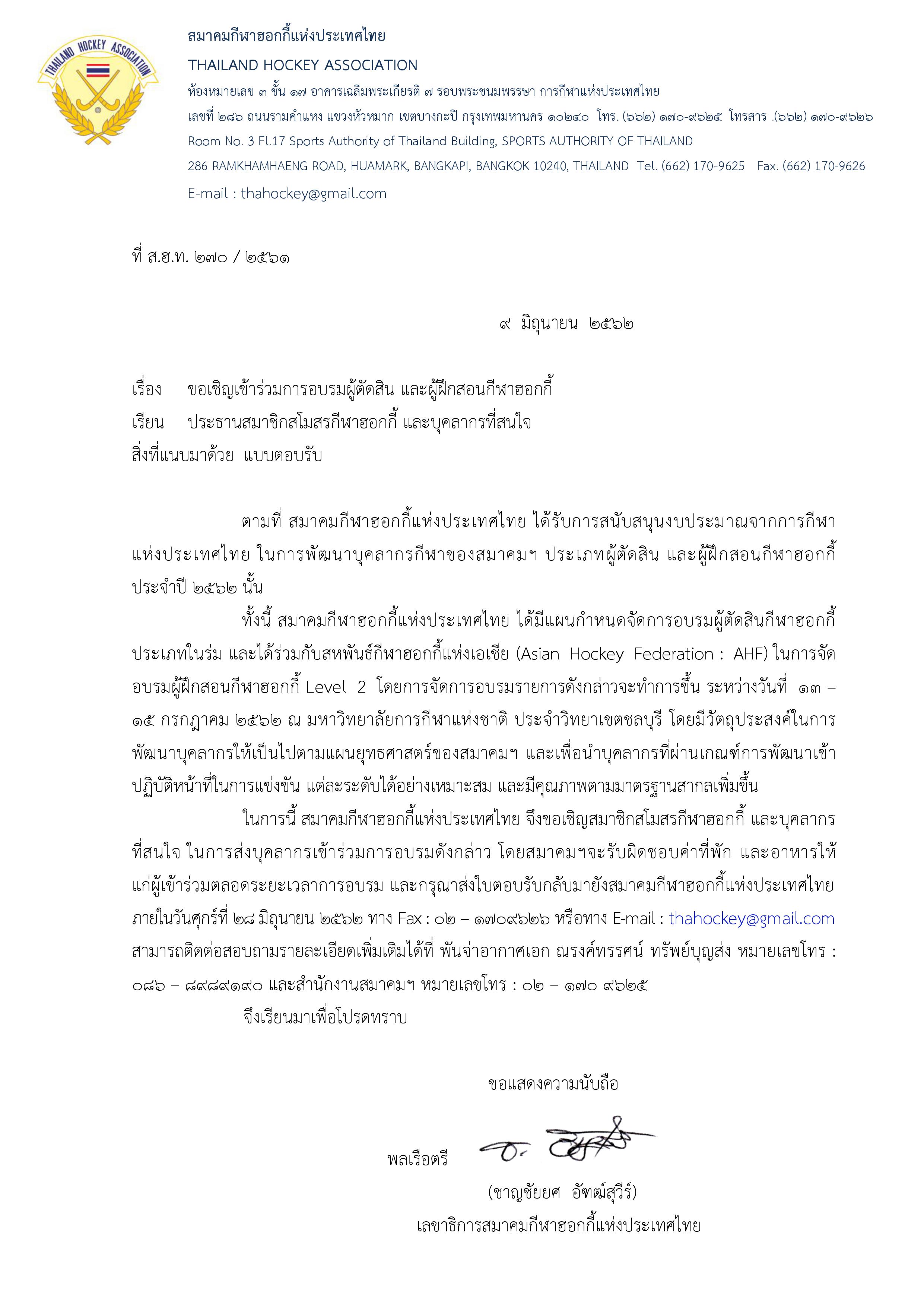 ส.ฮ.ท.270 -62 เรื่องขอเชิญเข้าร่วมการอบรมผู้ตัดสิน และผู้ฝึกสอนกีฬาฮอกกี้