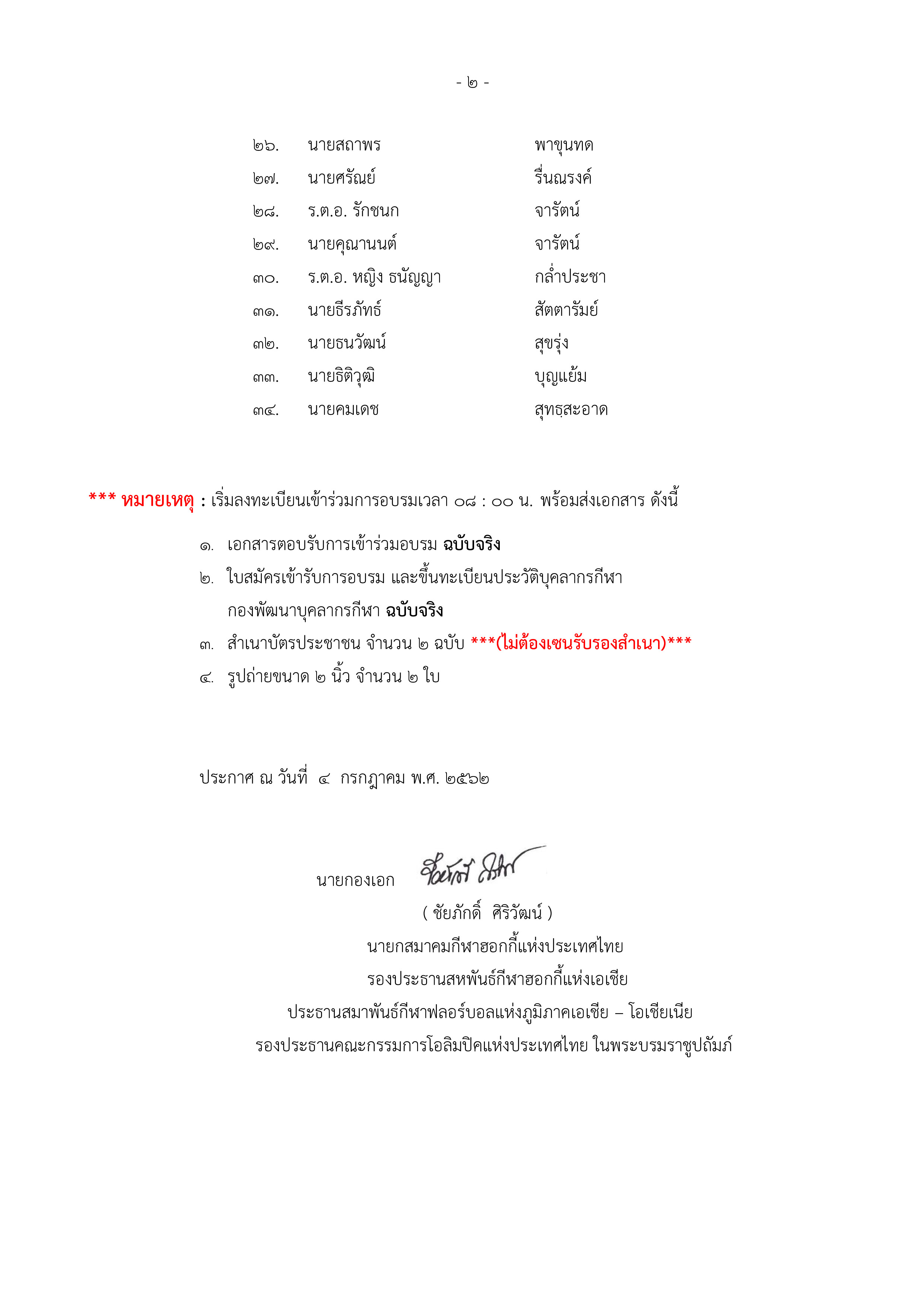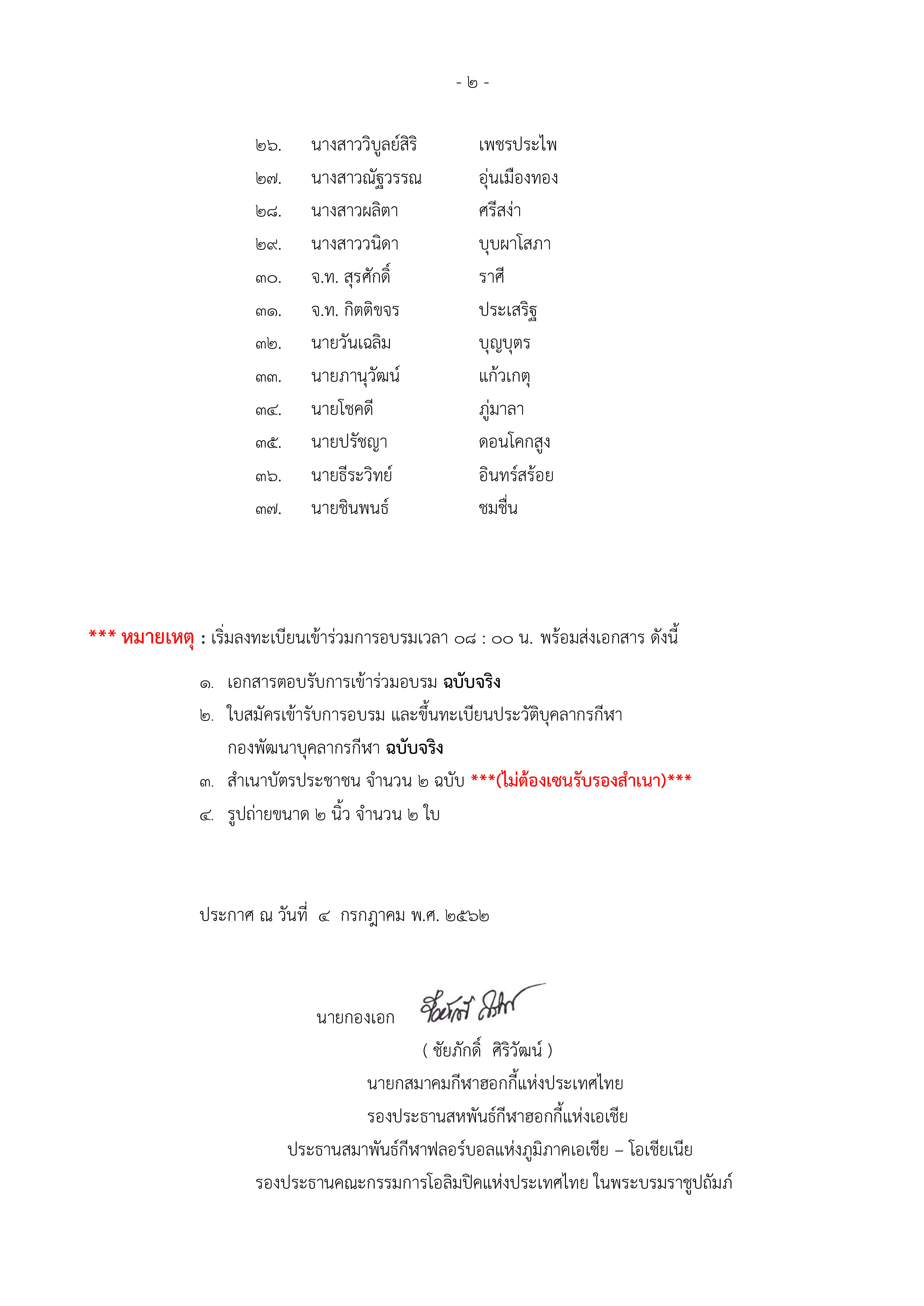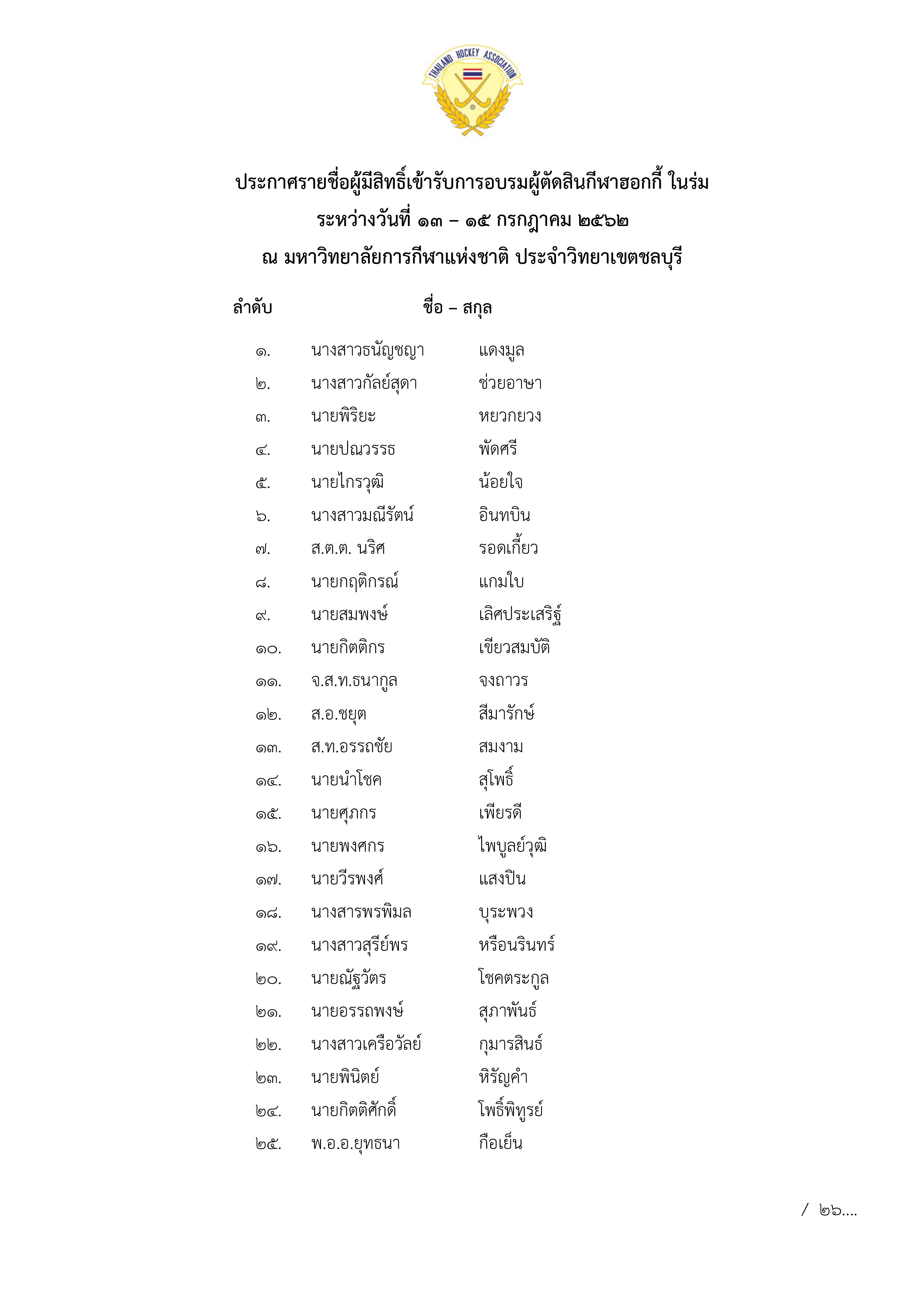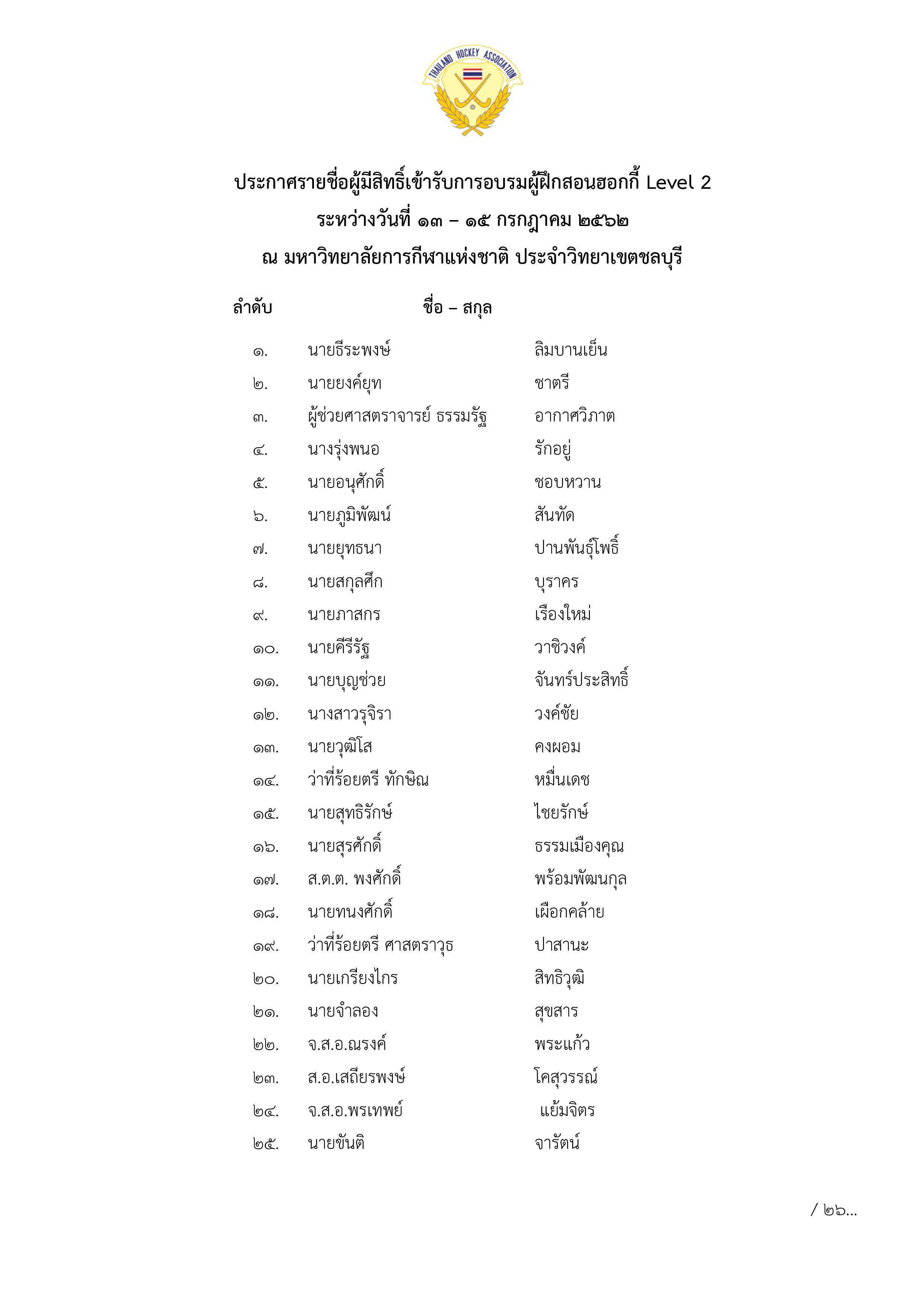ประกาศรายชื่อผู้มีสิทธิ์เข้ารับการอบรมผู้ฝึกสอน Level 2 และผู้ตัดสินกีฬาฮอกกี้ ในร่ม ระหว่างวันที่ ๑๓ – ๑๕ กรกฎาคม ๒๕๖๒ ณ มหาวิทยาลัยการกีฬาแห่งชาติ ประจำวิทยาเขตชลบุรี *** หมายเหตุ *** ผู้ที่มีความประสงค์เข้าพักวันที่ 12 กรกฎาคม 2562 กรุณาแจ้งแก่ผู้ประสานงาน และเจ้าหน้าที่ ดาวโหลดเอกสารเพิ่มเติม vvvvvvvvvvvvv ประกาศรายชื่อผู้มีสิทธิ์เข้ารับการอบรมผู้ฝึกสอนฮอกกี้ Level 2 ประกาศรายชื่อผู้มีสิทธิ์เข้ารับการอบรมผู้ตัดสินกีฬาฮอกกี้ ในร่ม