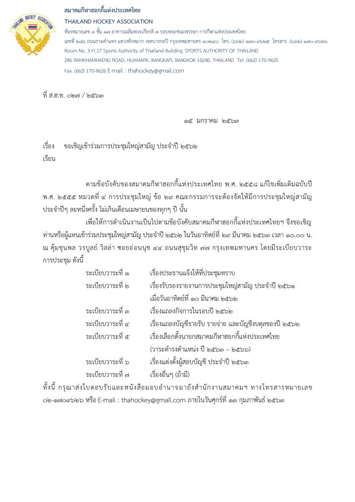 ทั้งนี้ กรุณาส่งใบตอบรับและหนังสือมอบอำนาจมายังสำนักงานสมาคมฯ ทางโทรสาร หมายเลข ๐๒-๑๗๐๙๖๒๖ หรือ E-mail : thahockey@gmail.com ภายในวันศุกร์ที่ ๑๔ กุมภาพันธ์ ๒๕๖๓