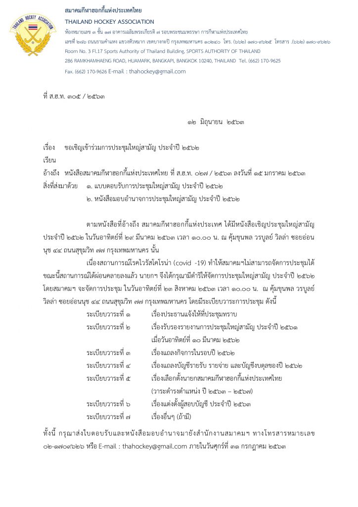 ทั้งนี้ กรุณาส่งใบตอบรับและหนังสือมอบอำนาจมายังสำนักงานสมาคมฯ ทางโทรสารหมายเลข ๐๒-๑๗๐๙๖๒๖ หรือ E-mail thahockey@gmail.com ภายในวันศุกร์ที่ ๓๑ กรกฎาคม ๒๕๖๓