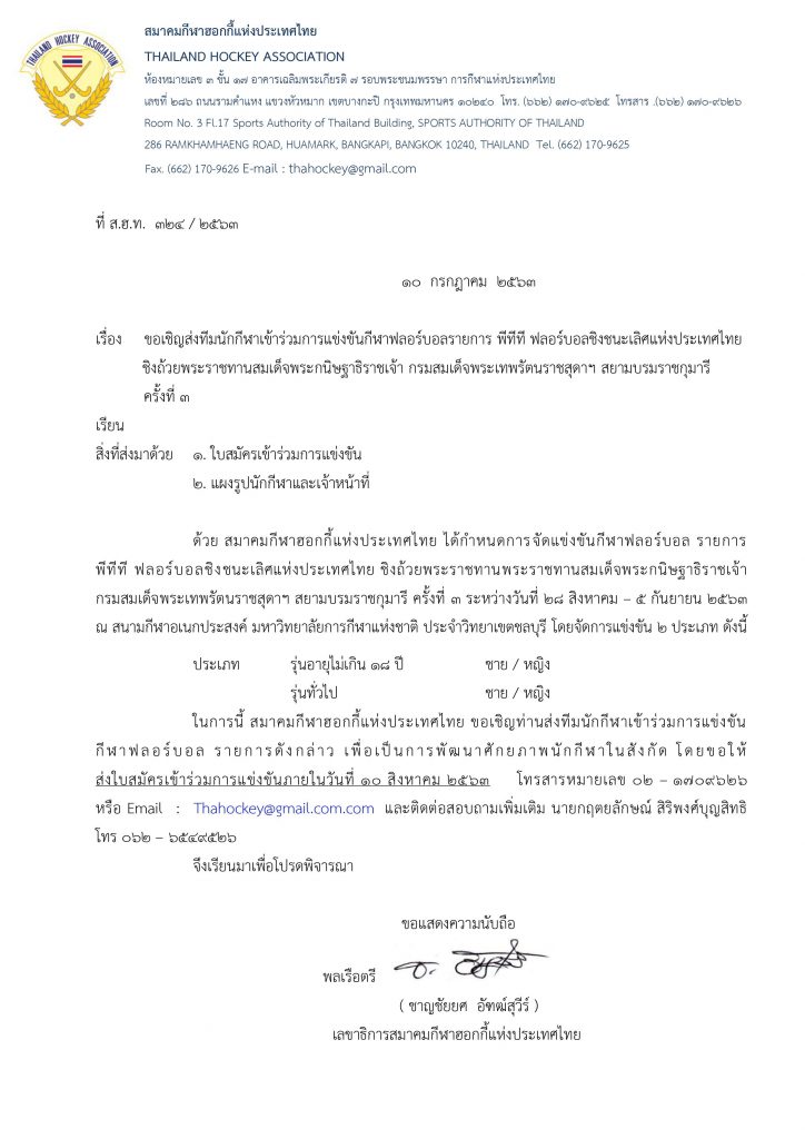 สมาคมกีฬาฮอกกี้แห่งประเทศไทย ขอเชิญท่านส่งทีมนักกีฬาเข้าร่วมการแข่งขันฮอกกี้รายการดังกล่าว เพื่อเป็นการพัฒนาศักยภาพนักกีฬาในสังกัด โดยขอให้ ส่งใบสมัครเข้าร่วมการแข่งขันภายในวันที่ ๑๐ สิงหาคม ๒๕๖๓ ทาง Fax : ๐๒ – ๑๗๐๙๖๒๖ หรือทาง Email : thahockey@gmail.com สามารถติดต่อสอบถามรายละเอียดเพิ่มเติมได้ที่สำนักงานสมาคมฯ หมายเลขโทร : ๐๒ – ๑๗๐ ๙๖๒๕