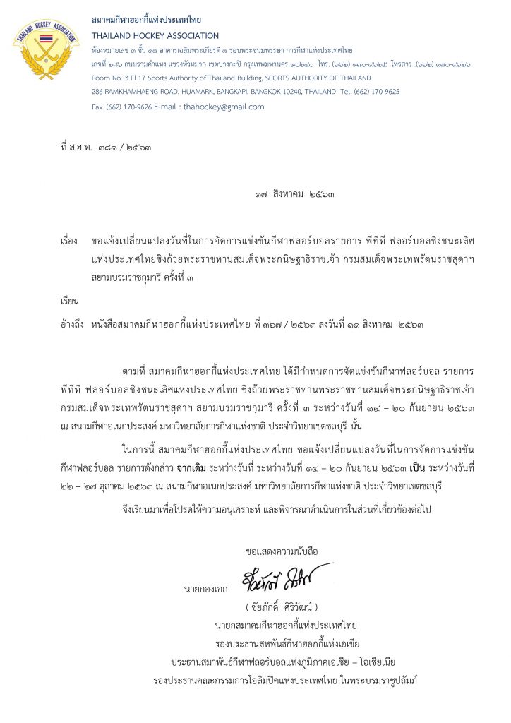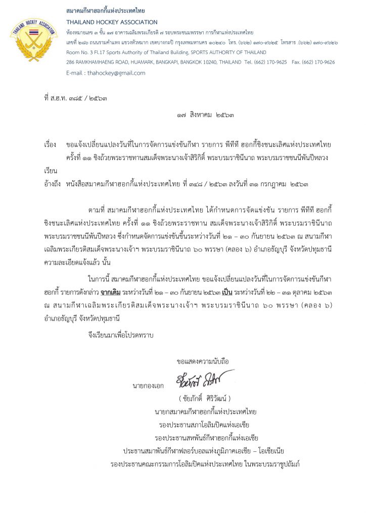 จากเดิม ระหว่างวันที่ ๒๑ – ๓๐ กันยายน ๒๕๖๓ เป็น ระหว่างวันที่ ๒๒ – ๓๑ ตุลาคม ๒๕๖๓ ๒๕๖๓ ณ สนามกีฬาเฉลิมพระเกียรติสมเด็จพระนางเจ้าฯ พระบรมราชินีนาถ ๖๐ พรรษา (คลอง ๖) อำเภอธัญบุรี จังหวัดปทุมธานี