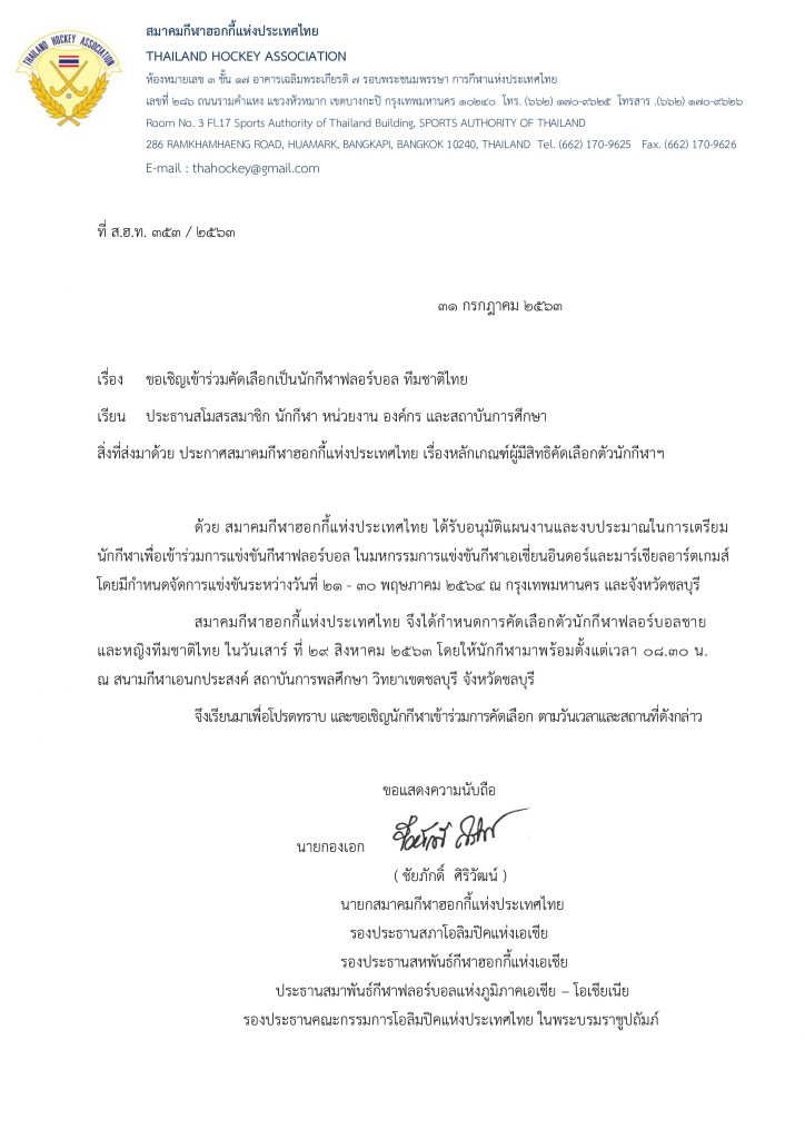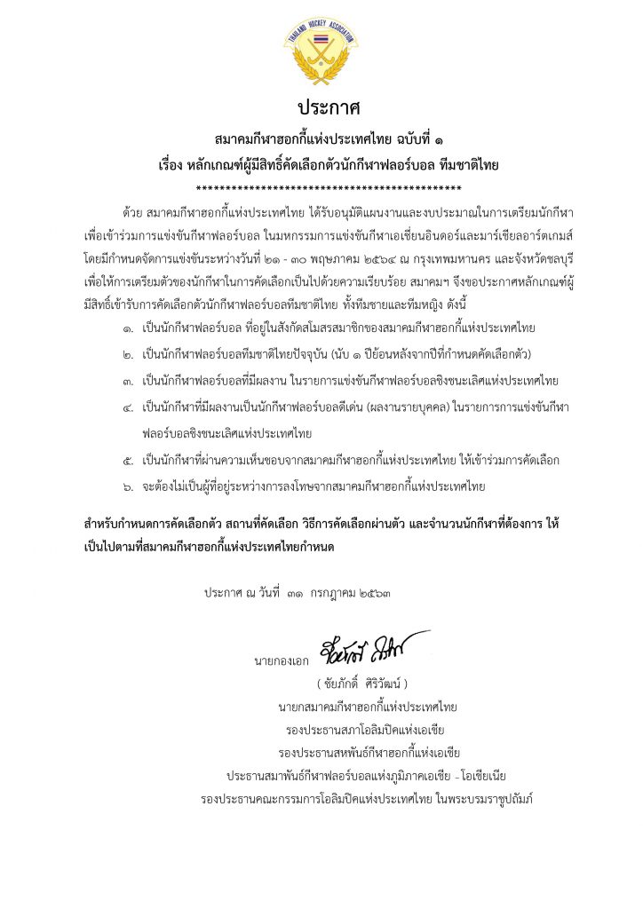 สมาคมกีฬาฮอกกี้แห่งประเทศไทย ได้กำหนดวันคัดเลือกตัวนักกีฬาฟลอร์บอล ทีมชาติไทย ประเภททีมชาย และทีมหญิง ในวันเสาร์ที่ ๒๙ สิงหาคม ๒๕๖๓ โดยให้นักกีฬามาพร้อมตั้งแต่เวลา ๐๘.๓๐ น. ณ สนามกีฬาเอนกประสงค์ สถาบันการพลศึกษา วิทยาเขตชลบุรี จังหวัดชลบุรี ส.ฮ.ท.353-63-เรื่องขอเชิญเข้าร่วมคัดเลือกเป็นนักกีฬาฟลอร์บอล-ทีมชาติไทย-1ดาวน์โหลด ประกาศฉบับที่-1-หลักเกณฑ์การคัดเลือกตัวนักกีฬาฟลอร์บอล-1ดาวน์โหลด