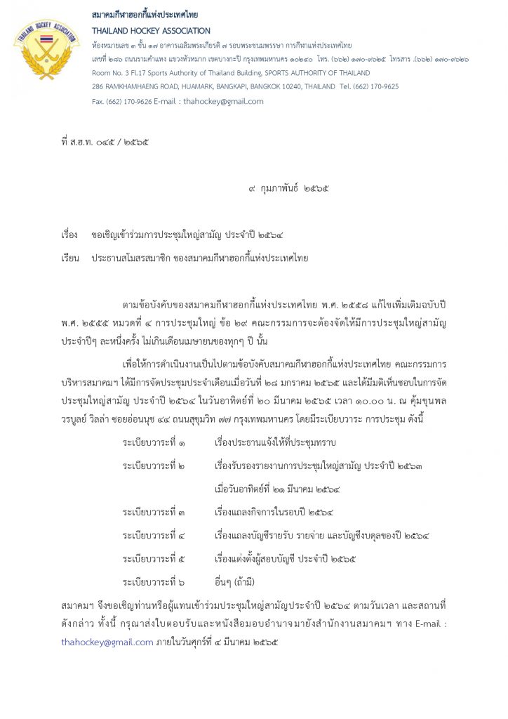 ทั้งนี้ กรุณาส่งใบตอบรับและหนังสือมอบอำนาจมายังสำนักงานสมาคมฯ E-mail : thahockey@gmail.com ภายในวันศุกร์ที่ ๔ มีนาคม ๒๕๖๕