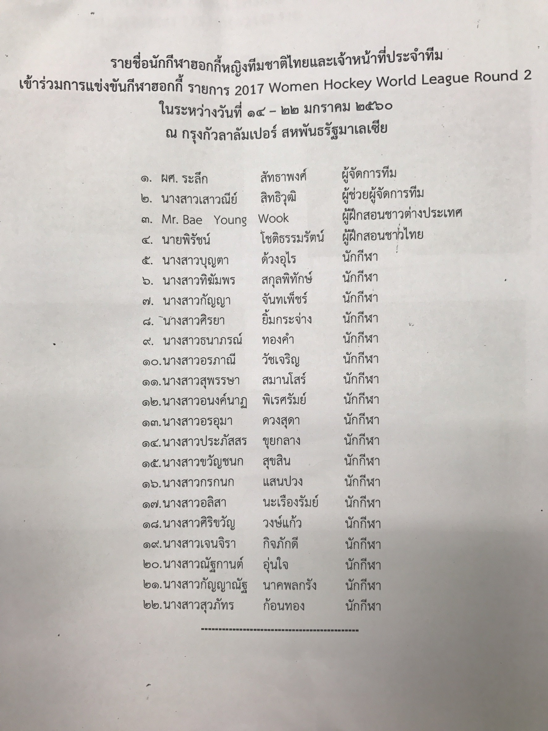 รายชื่อนักกีฬาฮอกกี้หญิงทีมชาติไทย รายการ Women Hockey World League Round2 / 2017